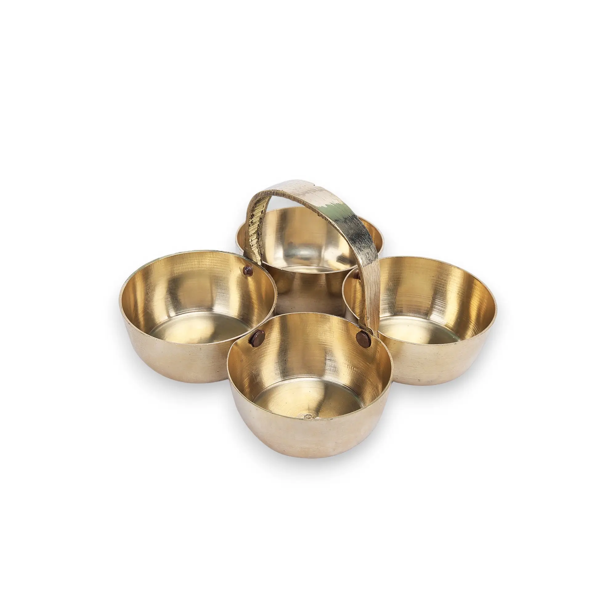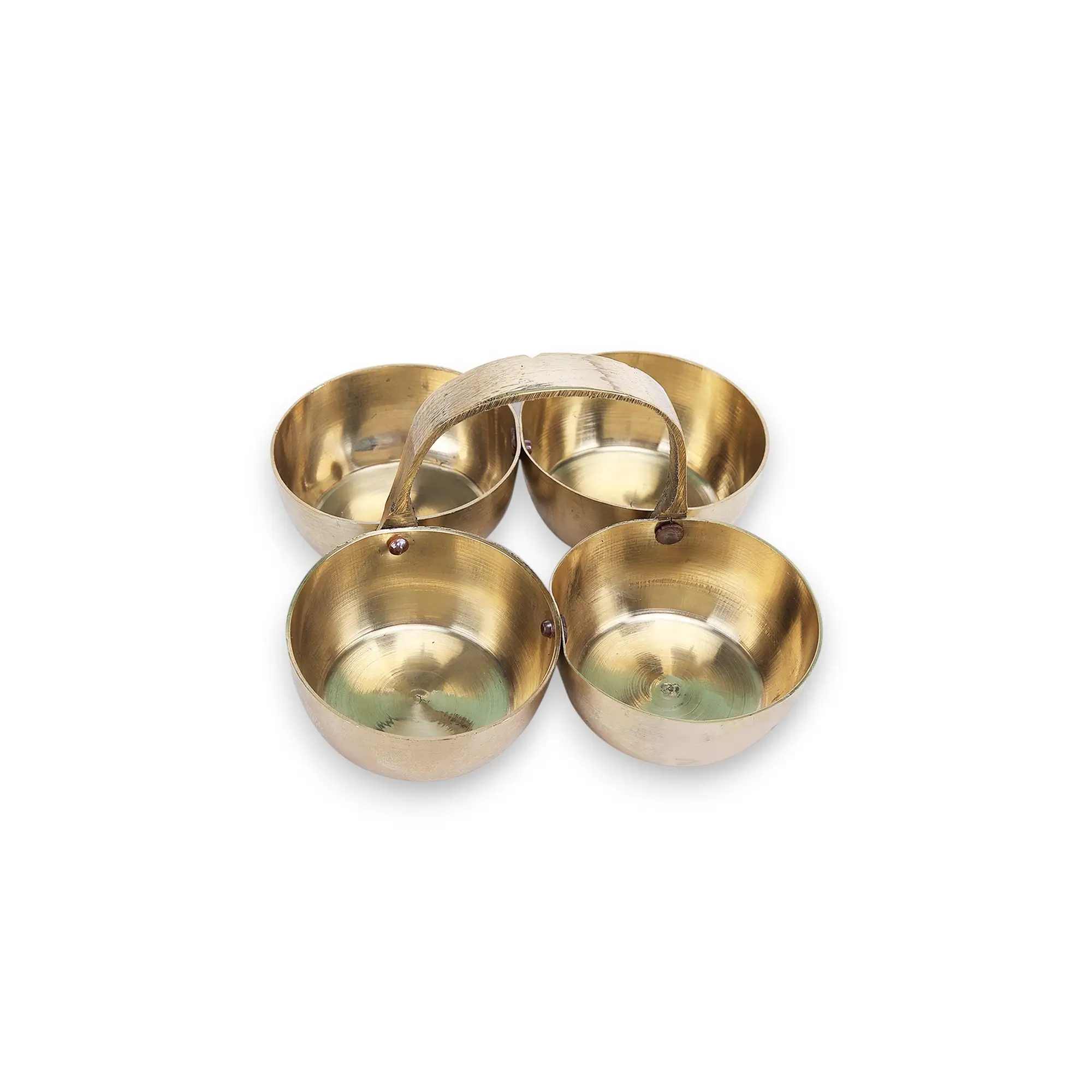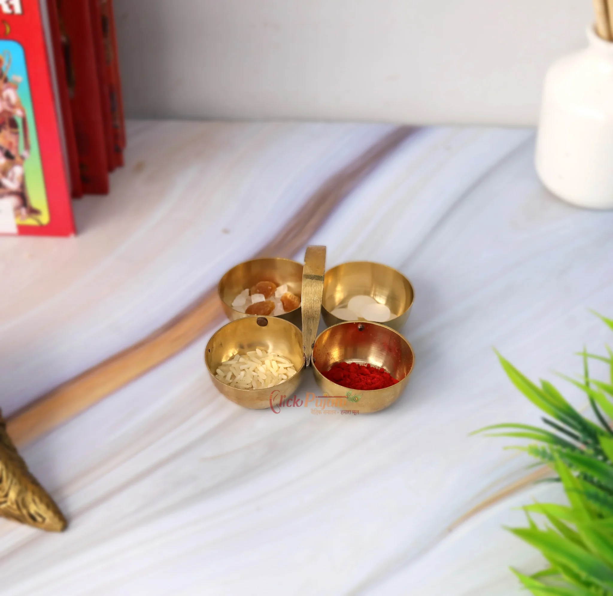 Click Pujan Chaukda Samagri Holder – Brass – Four Bowl Pooja Accessory with Handle | Traditional Puja Item for Mandir & Rituals | Decorative Brass Chaukdi for Festivals & Daily Worship